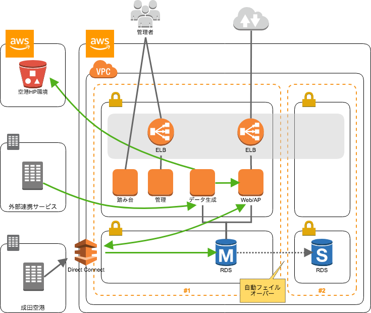 オンプレミスでサービス提供してきた『フライトインフォメーションサービス』をAWSへ移行するにあたり、空港情報通信様が提供する複数のサービスをAWSへ移行した実績からcloudpackにお声がけいただきました。AWSへのシステム移行に伴い、お客様が事前に設計されたインフラ構成図を基に、構成上の問題点や成田空港のシステムからAWSへの接続方法など、AWS上でシステムを運用する上で問題になり得る点をお客様とともにひとつひとつ解消した上で構築を進めていき、安定した運用を実現いたしました。
