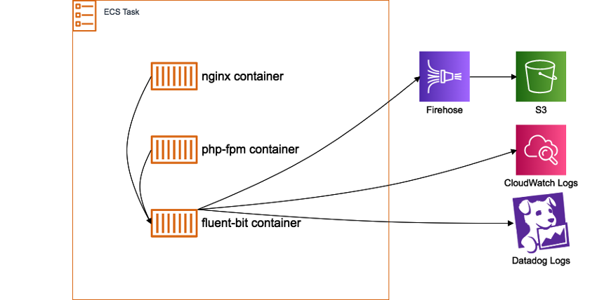 また、コンテナログ転送にはAWSコンテナイメージ向けの Fluent Bitプラグインを利用し、送信先としてAmazon CloudWatchとAmazon Kinesis Data Firehoseへのルーティングを可能としました。