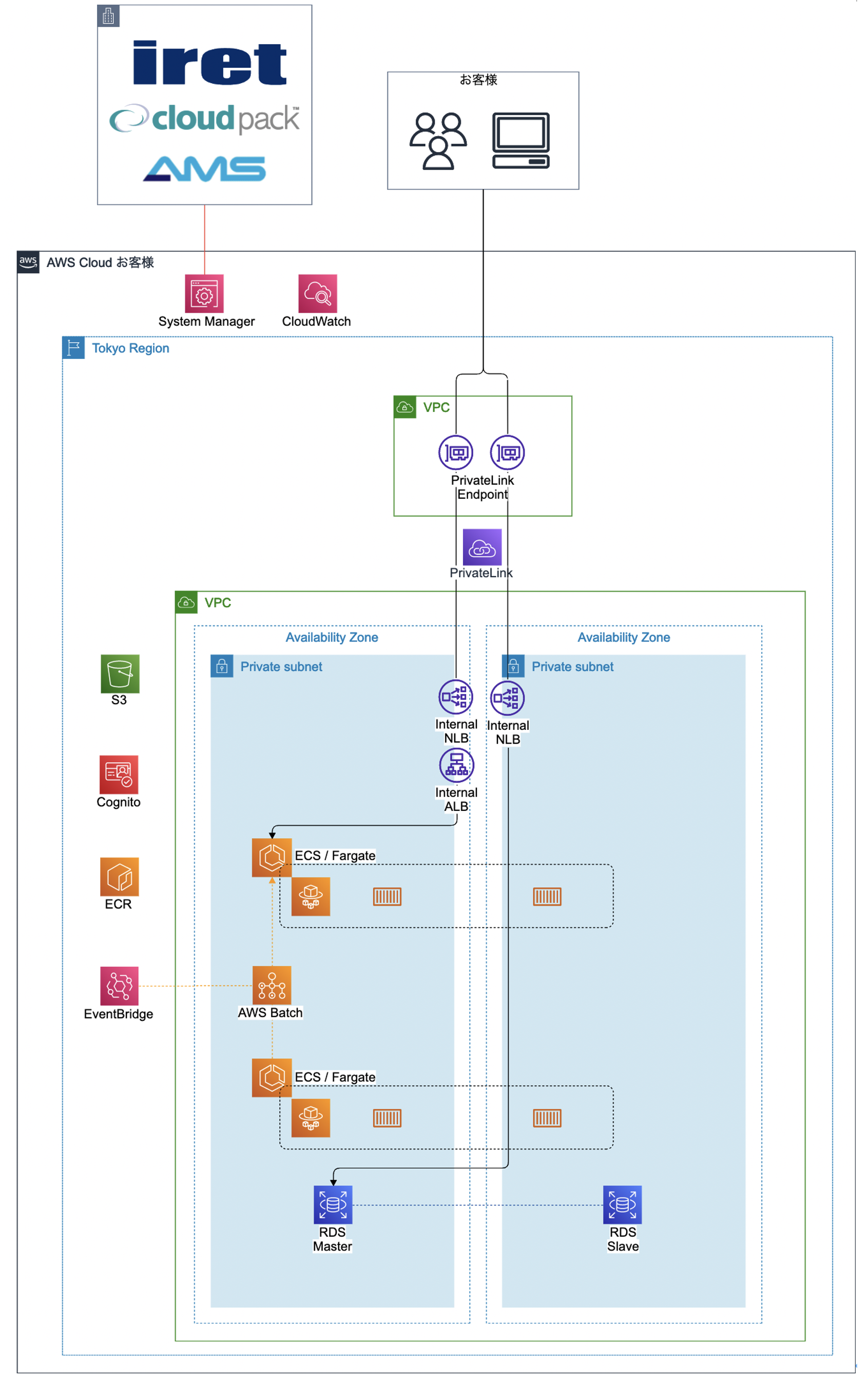グリット様は、自らが AWS 上に構築されたインフラ・エネルギー業の事業支援システムにおいて、厳しい要件を満たした上での24時間・365日の監視および運用保守のサービスを導入し、セキュアで安定したシステム運営を実現したいというご要望をお持ちでした。そこでアイレットが、ご要望を実現するための監視および運用保守を担当しました。