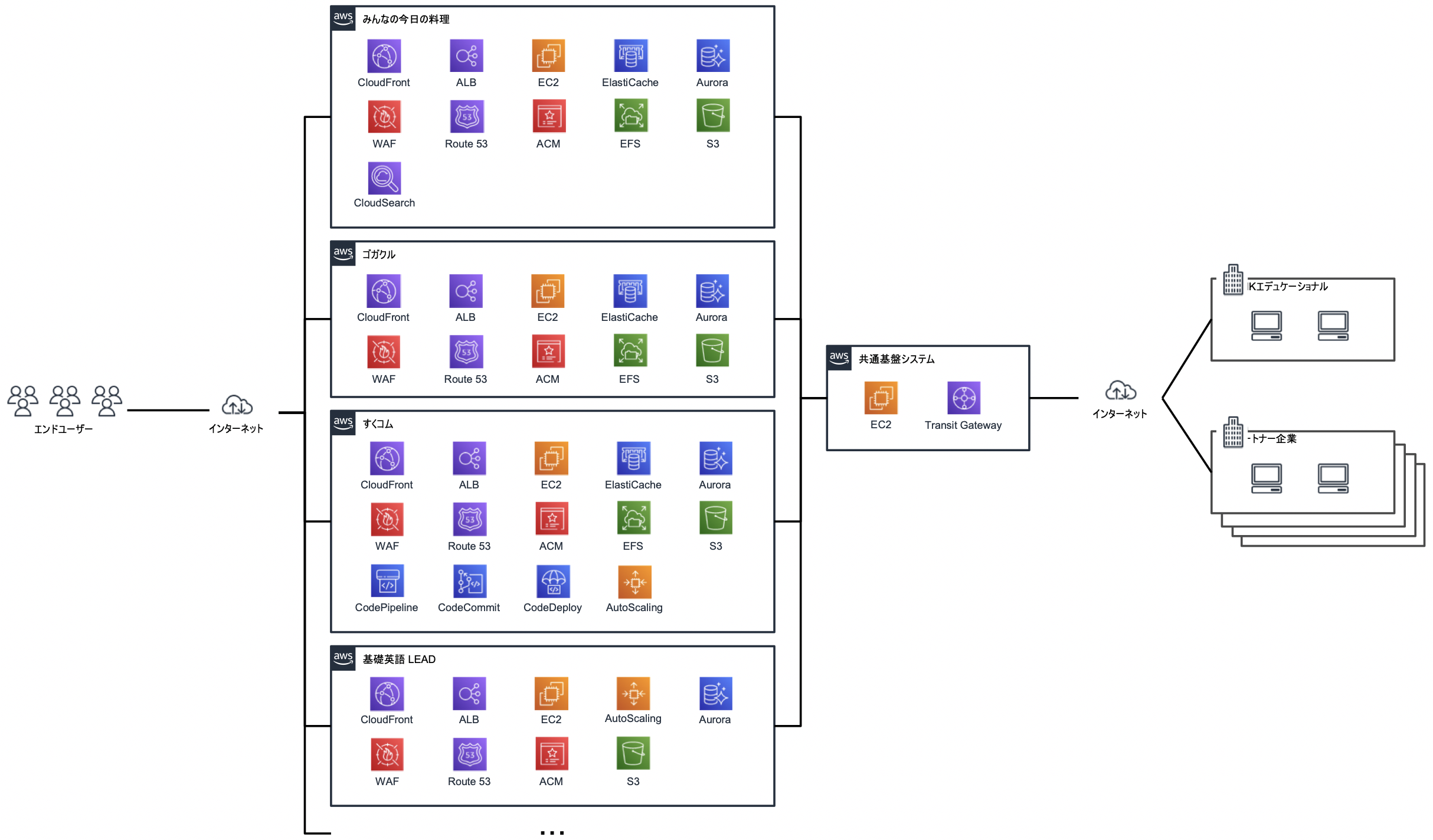今回のデジタル基盤構築作業におけるポイントは、複数の Web サイト・業務システムが移行対象であること。「みんなのきょうの料理」「ゴガクル」「すくコム」などの BtoC 向け Web サイト、「基礎英語 LEAD」などの BtoB 向け Web サイト、そして業務システムの計8つの Web サイト・業務システムの移行を並行して進める必要がありました。