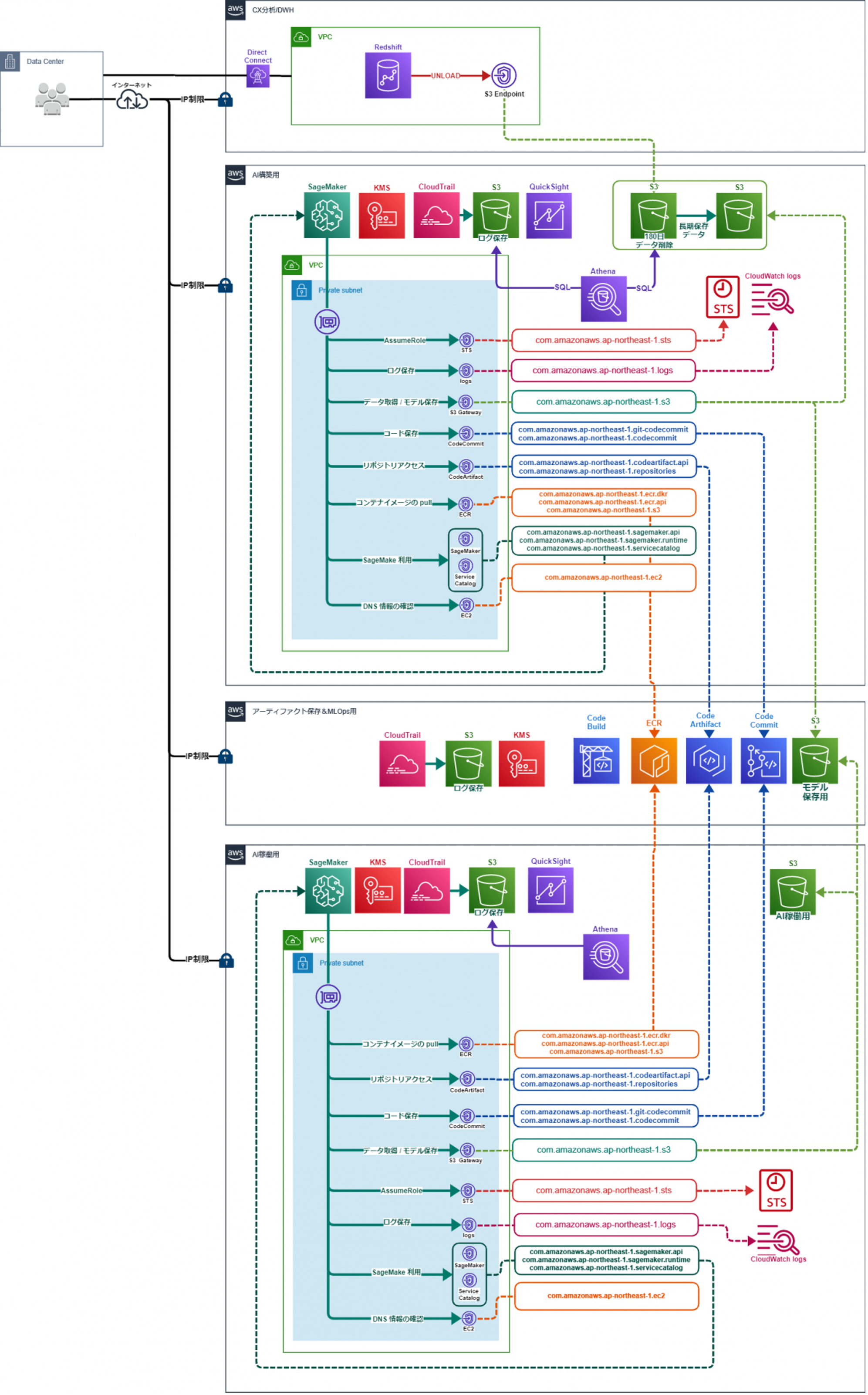 AI 構築は機械学習モデルの開発やトレーニング、デプロイメントまでを一気通貫で効率的に実現する AWS SageMaker を採用。ここでポイントなのが、Amazon VPC で AWS アカウント内に仮想ネットワークを構築し、Amazon VPC 内部に AWS SageMaker を置いている点です。AWS SageMaker を Amazon VPC 内部に閉じ込めることでインターネットからのアクセスを遮断しているため、データが外部に流出したり、外部のデータを内部に取り込んでしまう心配がありません。この環境を実現するため、用途別に適切なエンドポイントを作成し、プライベートなアドレスにアクセスするような仕組みを構築しています。