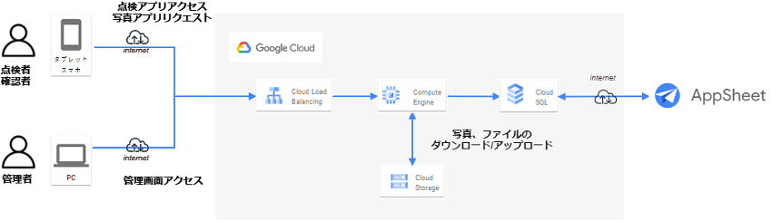 インフラ環境には Google Cloud を採用し、アプリ開発の一部に、Excel シートや SQL データベースをデータソースとしてスムーズにアプリケーションが構築可能なノーコードツール「AppSheet」を活用しました。これにより、マスターデータの一覧表示や編集実行などを、プログラムを記述することなく管理画面上で簡単に実現することができました。また、管理画面における機能追加などのアップデートをお客様自身で行えるようになったほか、システムによる点検結果をExcelシートに出力することも可能となりました。各遊具の状態をABCなどのランクで評価し、撮影した写真と一緒に公園を管理している地方自治体へ納品する、といった面倒な作業もこれまでは手作業で行っていましたが、本システムにより自動化され、点検者の工数や管理の手間が大きく削減されました。