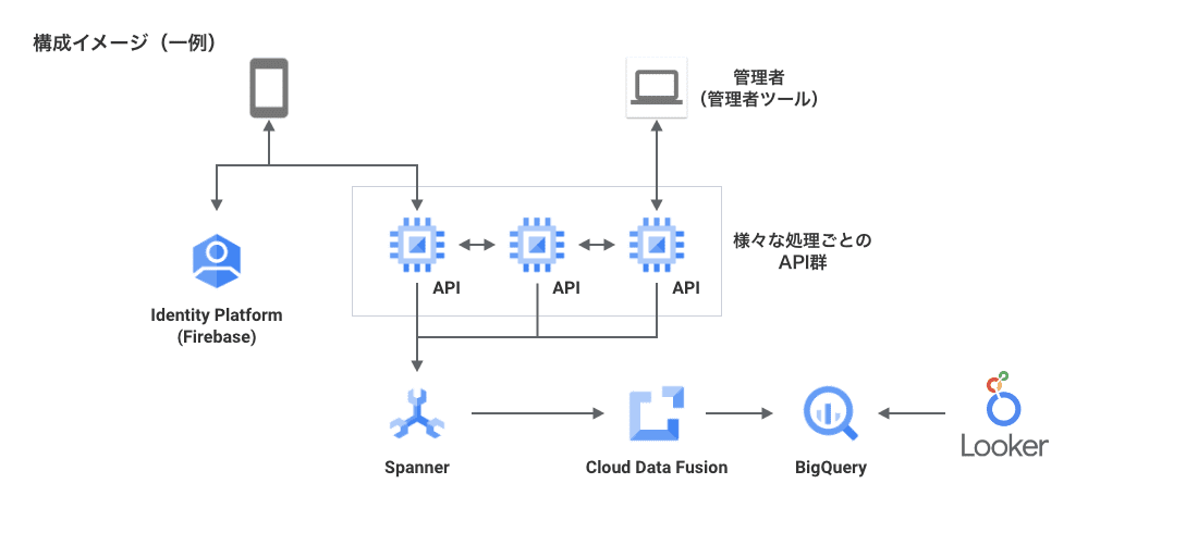 クラウド環境には Google Cloud を採用し、ログイン認証部分などに「Firebase」、分散データベースに「Cloud Spanner」、さらにあらゆるデータを簡単に探索・分析・共有できる次世代ビジネスインテリジェンス(BI)プラットフォーム「Looker」を活用。Google Cloud との親和性を最大限享受することで、迅速な開発と運用コストの削減を実現しました。