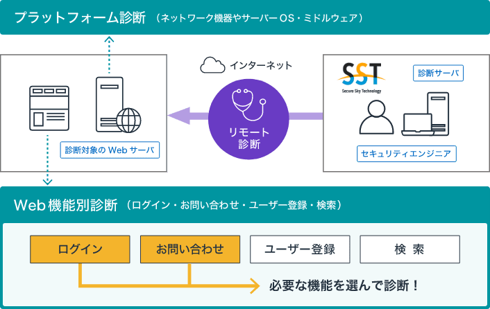 お客様の予算と用途に合わせて、Web機能別診断、プラットフォーム診断のプランから選択できます。